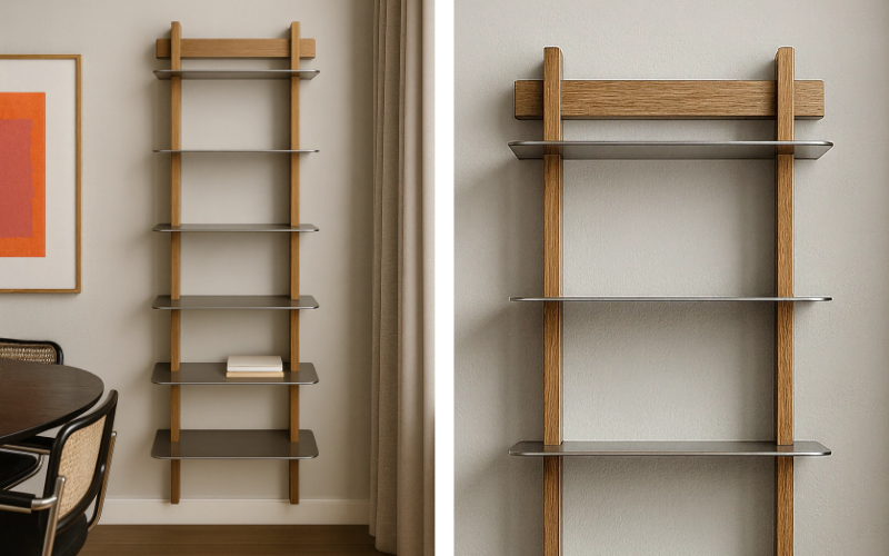 Soporte que se engrampa a pared, parantes verticales de madera maciza y estantes que se encastran.